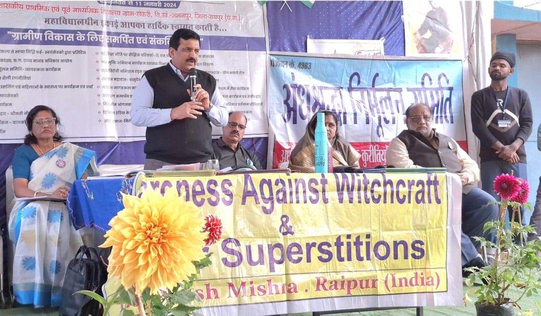 # अंधश्रद्धा निर्मूलन समिति के अध्यक्ष व नेत्र विशेषज्ञ डॉ. दिनेश मिश्र ने राजधानी से नजदीक ग्राम सकरी में ग्रामीणों एवम शासकीय महाविद्यालय अभनपुर के छात्रों को संबोधित करते हुए कहा देश में अंधविश्वास और सामाजिक कुरीतियों के कारण अक्सर अनेक निर्दोष लोगों को प्रताड़ना का शिकार होना पड़ता है,जिससे निदान के लिए आम जन में वैज्ञानिक दृष्टिकोण के विकास की अत्यंत आवश्यकता है.