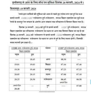 20 फरवरी, 2024 को दुर्ग से चलने वाली 13287 दुर्ग-राजेन्द्रनगर, साउथ बिहार एक्सप्रेस का परिचालन राजेन्द्रनगर के स्थान पर आरा तक विस्तार किया जा रहा है। 20 फरवरी, 2024 को राजेन्द्रनगर से चलने वाली 13288 राजेन्द्रनगर-दुर्ग, साउथ बिहार एक्सप्रेस का परिचालन राजेन्द्रनगर के स्थान पर आरा से दुर्ग के लिए रवाना होगी । जिसकी समय सारणी इस प्रकार है :-