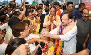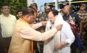 रायपुर। भाजपा के राष्ट्रीय अध्यक्ष जेपी नड्डा आज एक दिवसीय प्रवास राजधानी रायपुर पहुंचे। यहां एयरपोर्ट पर जेपी नड्डा का मुख्यमंत्री विष्णुदेव सहित प्रदेशाध्यक्ष किरण देव, मंत्रियों और कार्यकर्ताओं ने भव्य स्वगात किया।