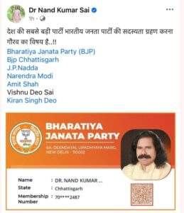 भाजपा में शामिल होने के बाद नंदकुमार साय ने मीडिया से बातचीत में कहा कि- भाजपा बनाने वाले हम लोग ही हैं। अविभाजित मध्य प्रदेश में अटल बिहारी वाजपेयी ने पार्टी की जिम्मेदारी सौपी थी। मैं शुरू से ही भाजपा का महत्वपूर्ण कार्यकर्ता रहा हूँ।”