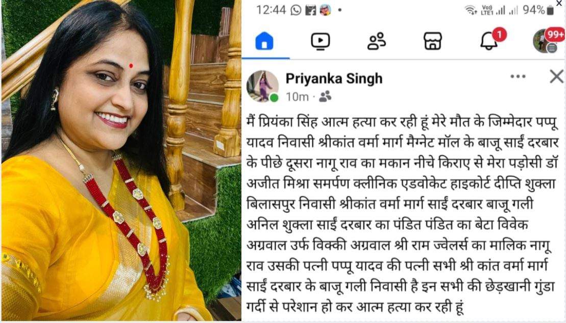 बिलासपुर। न्यायधानी के श्रीकांत वर्मा मार्ग पर रहने वाली रेल कर्मचारी की पत्नी प्रियंका सिंह की आत्महत्या मामले में पुलिस ने अपनी जांच शुरू कर दी है। प्रियंका सिंह ने आत्महत्या से पहले फेसबुक पर लाइव वीडियो पोस्ट कर अपने पड़ोसियों और कुछ अन्य लोगों पर प्रताड़ना और छेड़खानी के गंभीर आरोप लगाए थे। पुलिस ने इस मामले में कुछ आरोपियों और गवाहों से पूछताछ शुरू की।