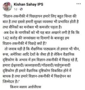आईपीएस किशन लाल फेसबुक पर खुद को युग प्रर्वतक लिखते हैं। उनके फेसबुक पर एक लाख 23 हजार से भी ज्यादा फॉलोअर हैं। वे किसी को फॉलो नहीं करते। अक्सर वे अपने आर्टिकल को लेकर विवादों में रहते हैं। हर आर्टिकल के नीचे खुद का नाम, पद और नंबर जरूर लिखते हैं। उनके आर्टिकल का विषय अक्सर भगवान, अल्लाह, गॉड, वाहे गुरू होता है। कुछ दिन पहले उन्होनें फेसबुक पर एक पोस्ट डाली थी, जो काफी वायरल हुई थी। उसमें लिखा था कि भगवान या अल्लाह काल्पनिक और अफवाह के अलावा कुछ नहीं है। उनका मानना है कि अगर भगवान या अल्लाह होते, तो वे भारतीयों को गुलाम नहीं बनने देते।