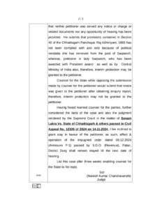 हाई कोर्ट ने जशपुर जिले की सरपंच सोनम लकरा की बर्खास्तगी को लेकर सुप्रीम कोर्ट द्वारा दिए गए फैसले का भी जिक्र किया और कहा कि शिकायत की पूरी तरह पुष्टि न हो और अगर कोई बड़ा मामला न हो तो ऐसी स्थिति में महिला सरपंच को मौका दिए बिना तत्काल हटाना उचित नहीं है। कोर्ट ने इस बात का भी जिक्र किया है कि सरपंच अंजिता अपने कार्यों के चलते राष्ट्रपति अवार्ड से भी पुरस्कृत है।