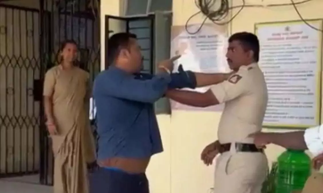 मंड्या। कर्नाटक के मंड्या से लोगों को हैरान करने वाला वाकया सामने आया है। यहां एक शख्स ने विवाद के दौरान स्टेशन में ड्यूटी पर तैनात पुलिसकर्मी को थप्पड़ जड़ दिया और उसका कॉलर भी पकड़ लिया। इस दौरान अन्य पुलिसकर्मियों ने शख्स को छुड़ाने की कोशिश की लेकिन उसके हौसले इतने बुलंद थे कि उसने दूसरे पुलिसकर्मी का कॉलर भी पकड़ लिया। यहां काफी देर तक झूमा झटकी चलती रही और आखिर तक शख्स ने पुलिस वालों को नहीं छोड़ा। इसका वीडियो जमकर वायरल हो रहा है। आरोपी व्यक्ति कथित तौर पर एक पूर्व नगरपालिका अध्यक्ष का बेटा है, जिसे पुलिस ने गिरफ्तार कर लिया।