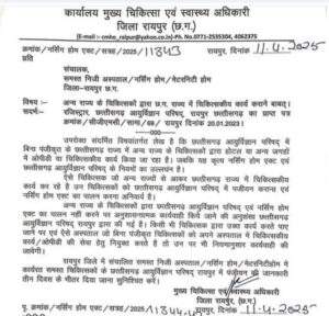 पत्र में कहा गया है कि रायपुर जिले में संचालित समस्त निजी अस्पताल / नर्सिंग होम/मेटरनिटीहोम में कार्यरत समस्त चिकित्सकों के छत्तीसगढ़ आयुर्विज्ञान परिषद् रायपुर में पंजीयन की जानकारी तीन दिवस के भीतर दिया जाना सुनिश्चित करें।
