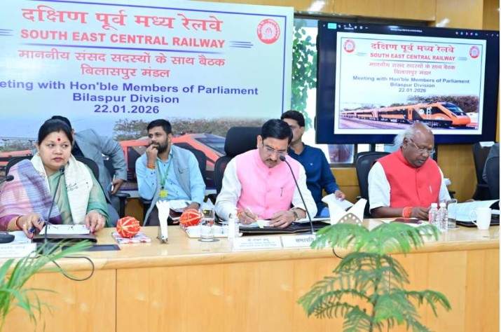 बिलासपुर। दक्षिण पूर्व मध्य रेलवे के बिलासपुर मंडल अंतर्गत बिलासपुर रेलवे परिसर में संसद सदस्यों की मंडल स्तरीय बैठक आयोजित की गई। बैठक की अध्यक्षता केंद्रीय राज्यमंत्री तोखन साहू ने की। बैठक में केंद्रीय राज्यमंत्री कमलेश जांगड़े, सांसद चिंतामणि महाराज, सांसद देवेंद्र प्रताप सिंह, राज्यसभा सांसद, सांसद प्रतिनिधिगण, रेलवे के महाप्रबंधक, बिलासपुर मंडल रेल प्रबंधक सहित वरिष्ठ अधिकारी उपस्थित रहे।